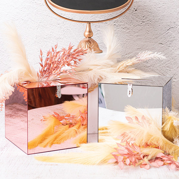 Minimalist and modern in design, our large acrylic wishing wells are available in both transparent and mirror finish varieties. This cube acrylic wishing well comes with a convenient slot for envelopes and cards. It has a sizeable amount of space for receiving and containing envelopes. It also comes with a latch that gives the recipient/s the option to lock the wishing well if they so choose.
