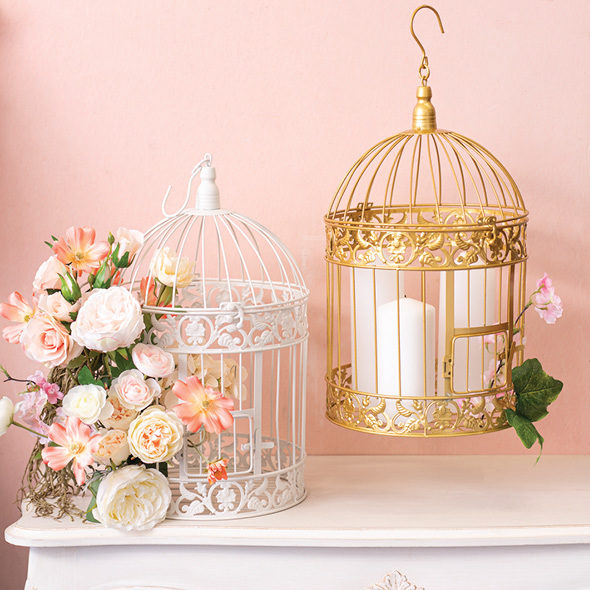 Our birdcages are versatile because they can function as more than just events wishing wells. Hang birdcages in your photo op space, display them as table centrepieces, and also them as aisle decorations. As a wishing well, these birdcages don’t need much decoration, as they are inherently ornate. Partially fill your birdcage wishing well with flower heads/petals or sit it beside a small arrangement of flowers for an extra romantic aesthetic.