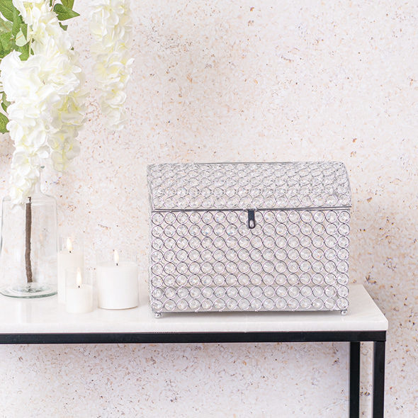 Our crystal wishing well chest is naturally decorative and eye-catching. Whether you choose to decorate this wishing well or not, its dimensions and reflective qualities mean that it naturally shines in every setting. Suggestions for decorations include a minimalistic floral arrangement and/or photo of the happy couple in a complementary photo frame. A light source like a candelabra near this wishing well would do really well to make the glass crystals glisten. As an added bonus, this wishing well is so gorgeous; you’ll want to repurpose it in the home as a jewellery box or trinket box.