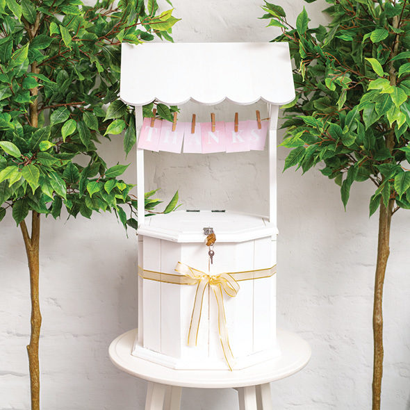 As a large and unembellished piece, this style of wishing well presents a great canvas for decoration. Attach fairy lights or decorate the roof with flowers to give you’re wishing well a more romantic sense of occasion. A simpler way to match this wishing well to your wedding decor is by surrounding it with pillar candles in glass vases and a low-sitting floral arrangement.