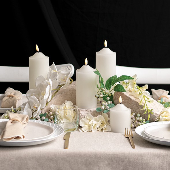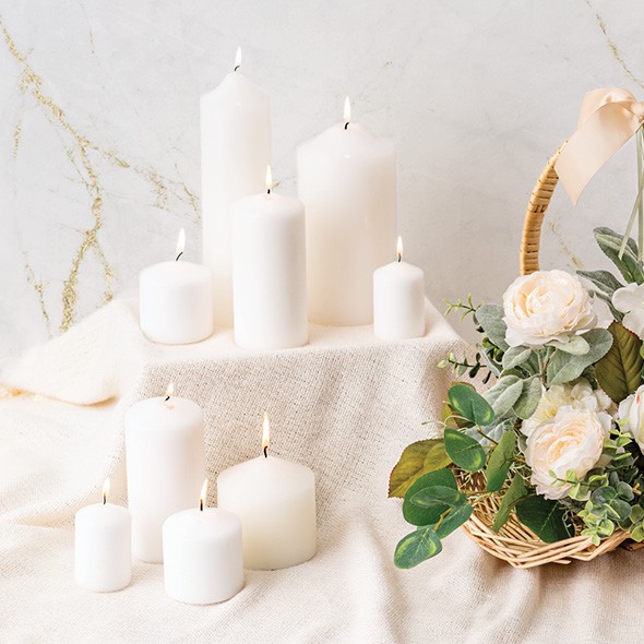 Pillar candles create a peaceful atmosphere, giving a timeless and traditional appearance to your space. They are available in white or coloured options and work well with lanterns, candle plates & mirrors, and glass vases.