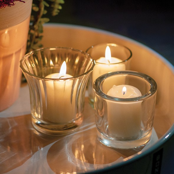 Votive candles look like a plug of wax that measures from 3.8cm high with a 3.7cm diameter. They are longer lasting candles than tealights, with a burn time of over 20 hours. Unlike tealight candles that are contained in a plastic or metal cup, votive candles are bare and will burn onto the surface of the holder. They are available in a variety of scented candles, plain white candles, and coloured candles.