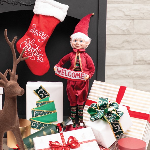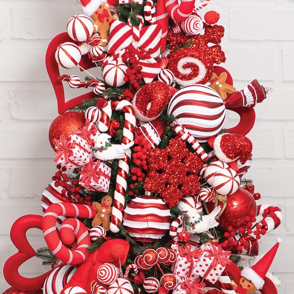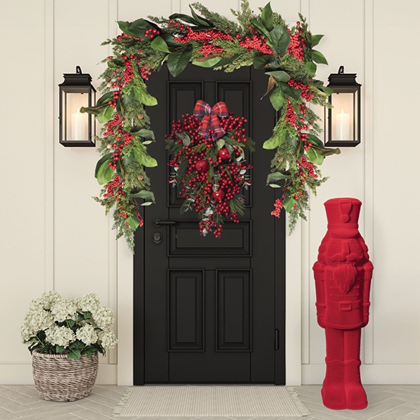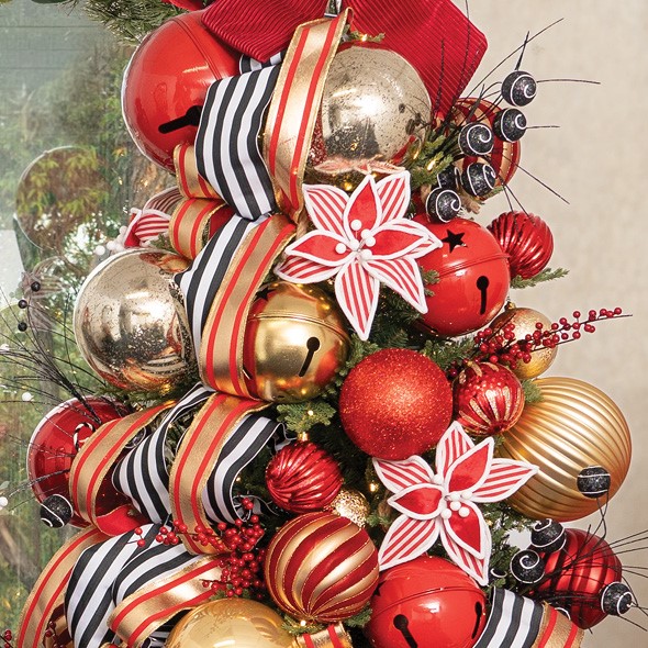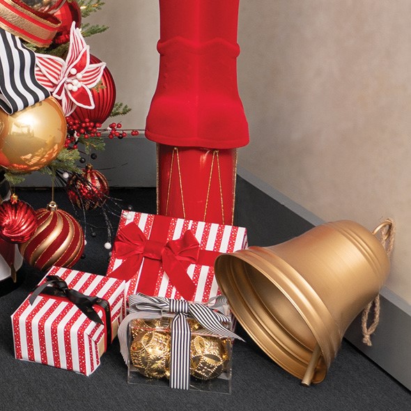 Use oversized decorations to play with line, form, and movement in your displays. For example, cascade oversized baubles down and around a tree to guide the eye and create rhythm. Or frame an entrance or window display with large bells to anchor your design and build visual layers.