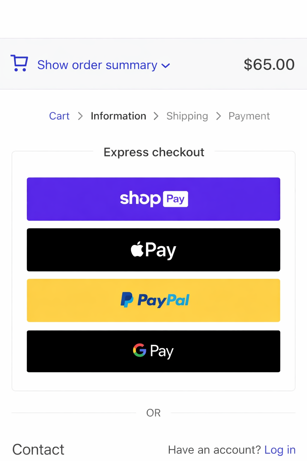 - Express checkout with Apple Pay, Shop Pay and Google Pay (on supported devices)