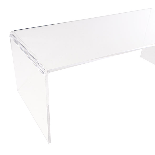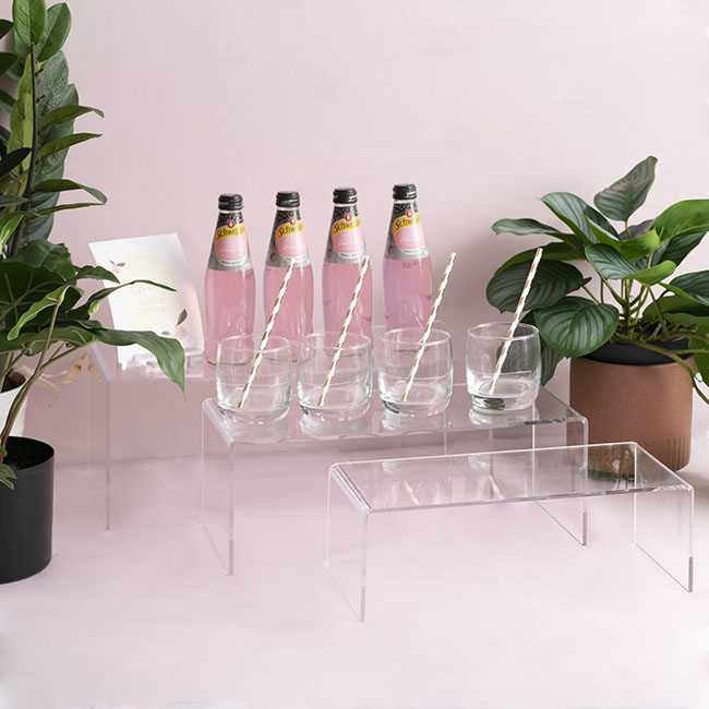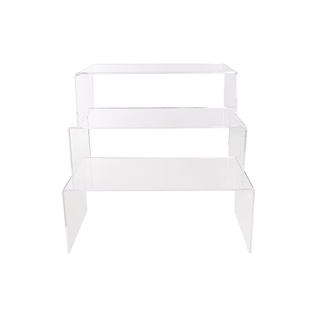 The smallest riser measures 34.7cm wide. 16cm deep, 11.7cm deep. The medium riser measures 39.5cm wide, 18cm deep, and 14.7cm tall. The largest riser measures 45cm wide, 20cm deep, and 17.6cm tall. This product is protected by an opaque layer of plastic, which should be removed prior to use.