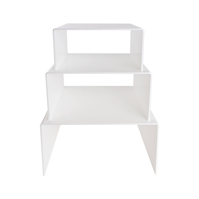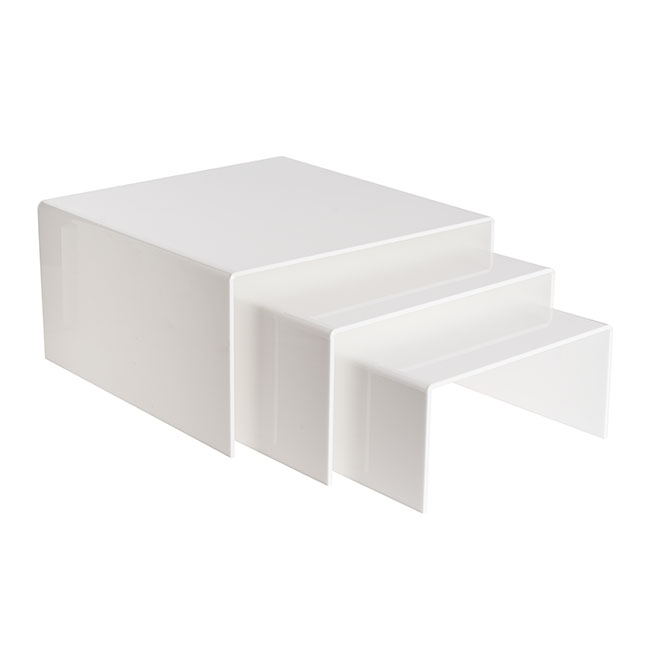 The smallest riser measures 24.8cm wide, 25cm deep, and 11.7cm tall. The medium riser measures 29.7cm wide, 30cm deep, and 14.8cm tall. The largest riser measures 35cm wide, 35cm deep, and 17.7cm tall.