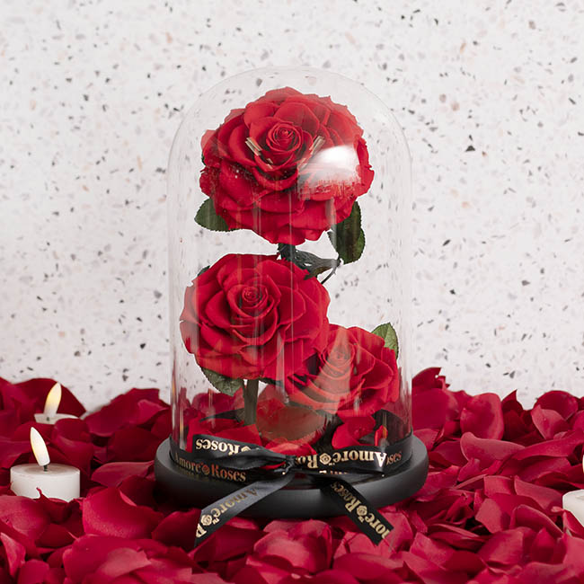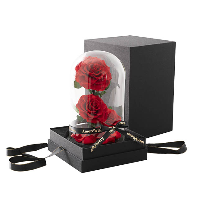 Our preserved Amore™ Forever Rose 3 Stem in Cloche in Red features three stem Red Roses with scattered petals at the base. Enclosed in a glass cloche with a wooden base, this romantic gift is perfect for celebrations of love.