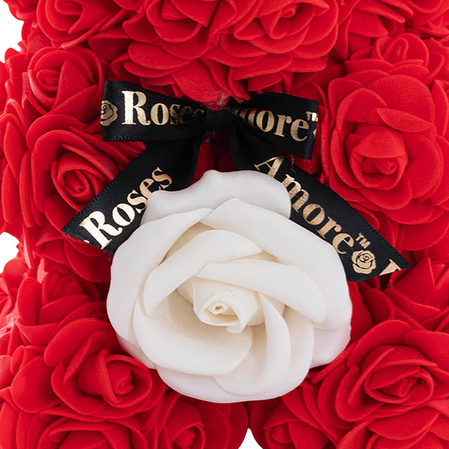 This Amore™ Rose Bear with White Flower & Black Bow holds a red flower and makes a fitting everlasting gift perfect for any occasion, whether as a romantic gesture or a heartfelt token of appreciation. Crafted from PE foam roses, this is a popular choice for romantic occasions like proposals, Valentine's Day, anniversaries, and more.