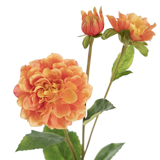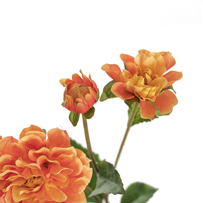 The Barla Zinnia Spray in Soft Coral has two flower heads and one bud, plus green foliage to work into flower garlands, deconstructed bridal bouquets and cascading flower arrangements. The stem measures 67cm tall and the diameter of the flower heads measure 3cm, 6.5cm and 9cm.