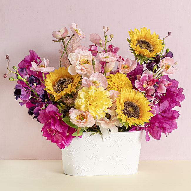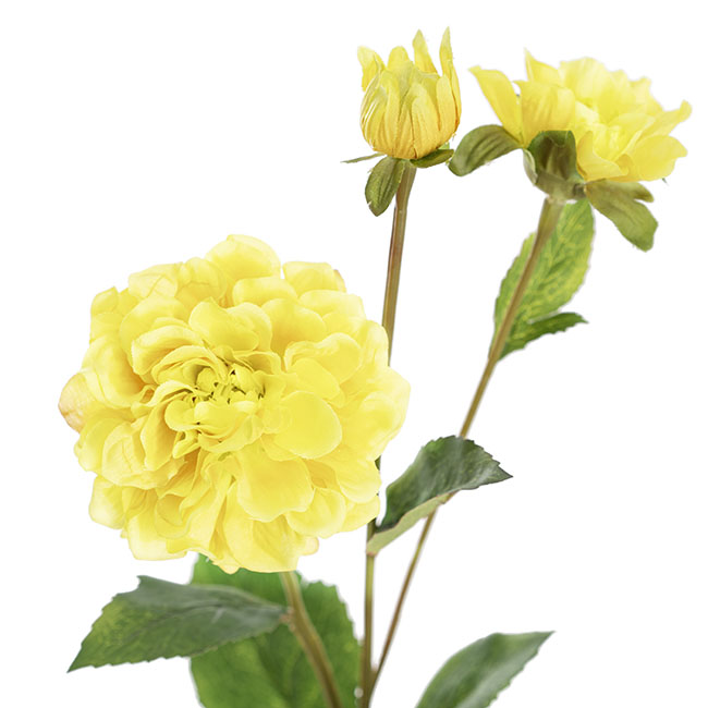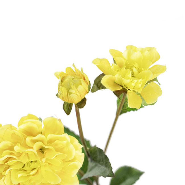 The Barla Zinnia Spray in Soft Yellow has two flower heads and one bud, plus green foliage to work into flower garlands, deconstructed bridal bouquets and cascading flower arrangements. The stem measures 67cm tall and the diameter of the flower heads measure 3cm, 6.5cm and 9cm.