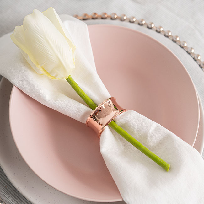 Available in packs of four, this napkin ring is also available in gold and silver. This napkin ring measures 47mm in diameter, with an inner diameter of 40mm. The height measures 23mm tall.