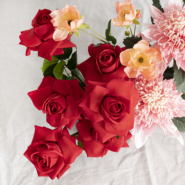This rose's head measures approximately 12cm when fashioned. The stem measures 65cm tall. This product is sold individually.