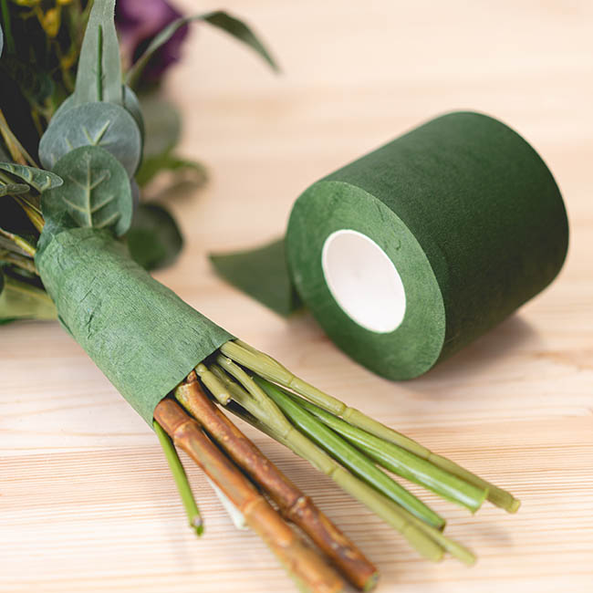 Loop this tape firmly around the circumference of your wreath to create a barrier that will help keep your styrofoam base from crumbling as you insert stems into it. This green tape also helps to camouflage any gaps in flowers or foliage, thanks to its dark green colouring.