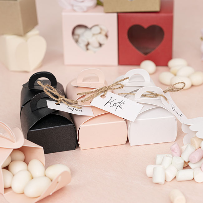 They are available in a pack of 20 and each comes flat-packed in one piece. You just fold together and tuck in. All fold lines are scored for easy assembly. 250gsm. Recyclable. This box will comfortably hold 6-8 sugared almonds.