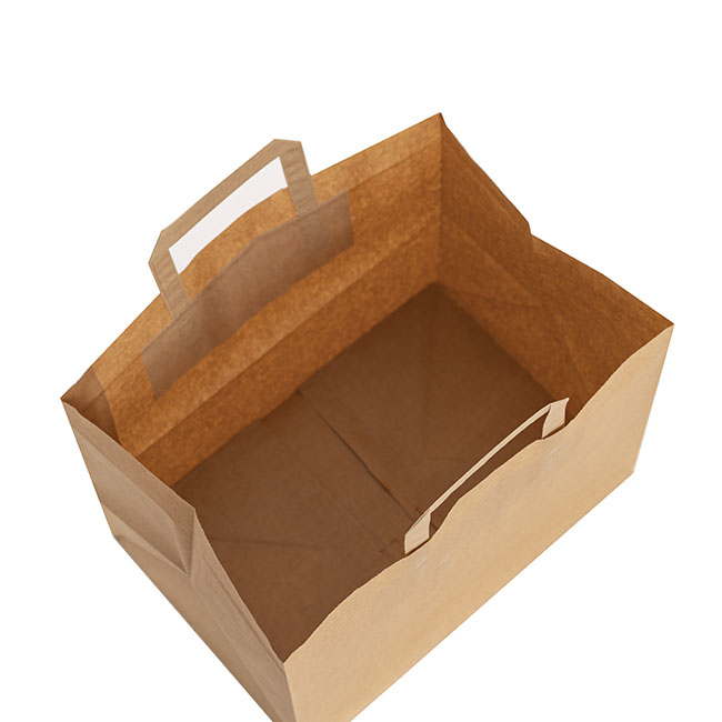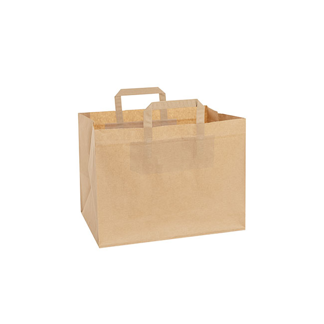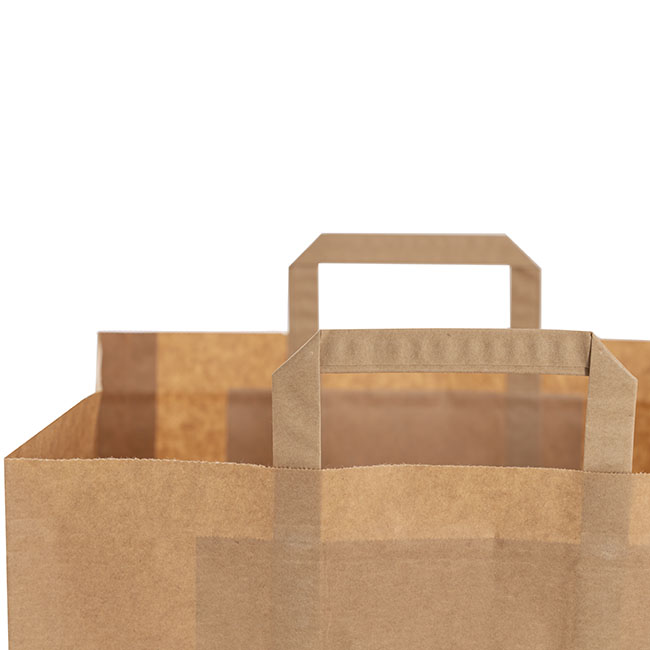 Large Brown Kraft Boutique Style Paper Bag features flat paper sturdy handle. Made from 70gsm kraft paper which has high elasticity and high tear resistance, designed for packaging products with high demands for strength and durability. Sits up on counter for easy packing. Can hold up to 10kg. Available in a pack of 10.