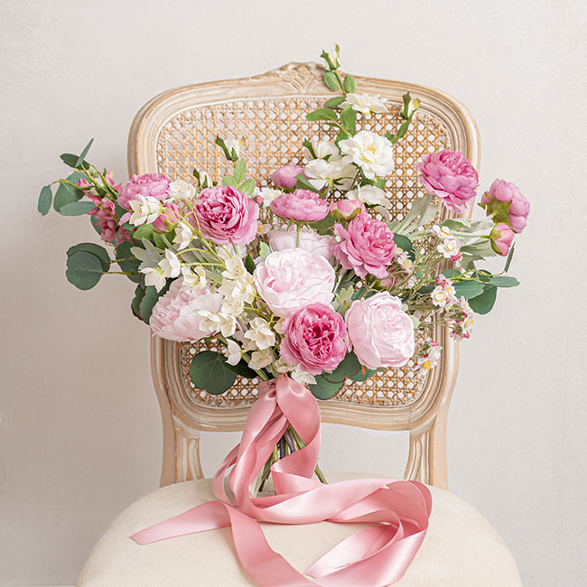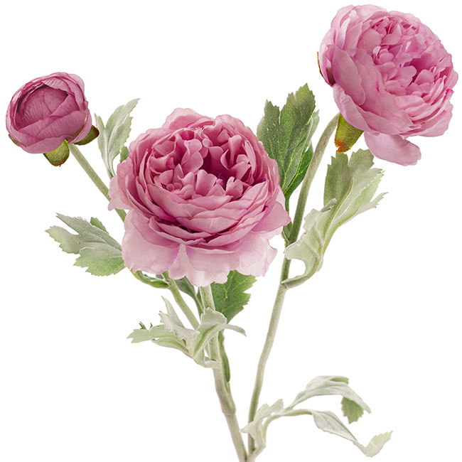 Our Buttercup Ranunculus Spray in Dusty Pink is 52cm in height and features three artificial flower heads, including 1 large (8cmD), 1 medium (7cmD), and 1 small bud (3.5cmD). A popular filler flower, this spray has a wire base, so the individual flowers can be posed into different shapes.