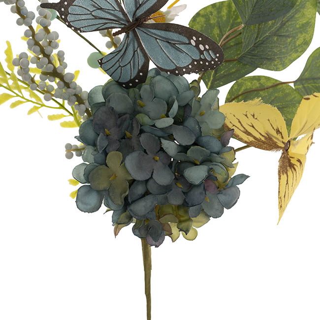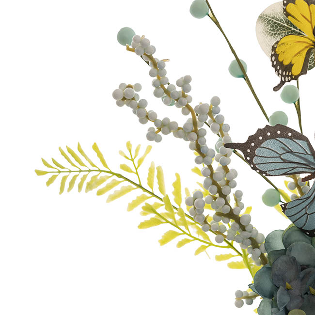 This Butterfly Hydrangea Fern Spray in Blue and Yellow is adorned with delicate butterflies, lush hydrangeas, and a mix of vibrant leaves. Perfect for vases, centerpieces, or floral displays, it brings an elegant Springtime elegant charm to your décor.