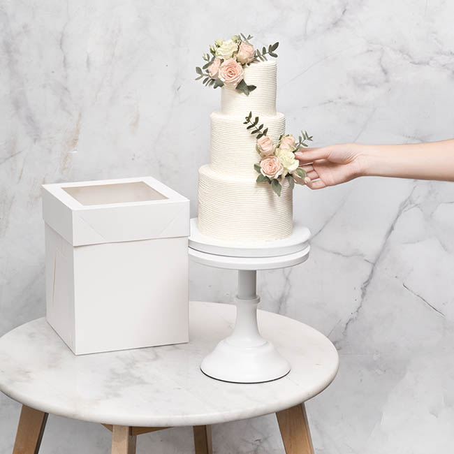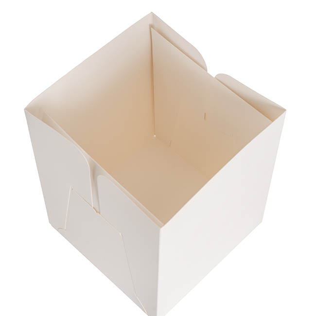 You can slide your cake in first and then assemble the front tuck in tabs or you can pre-assemble and lower your bakes in.