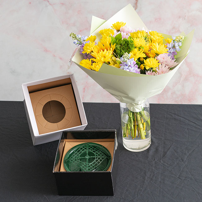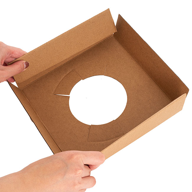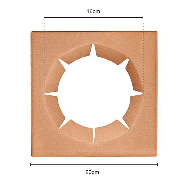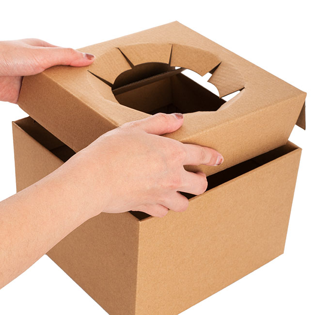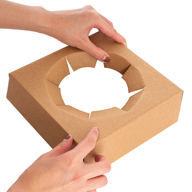 This corrugated cardboard insert is sold flat and fits snugly into our large posy boxes (order code: 14937). Use this insert to secure floral vase arrangements in vase during transit. This product is also suitable for use with our number 6 bowl and guard. This insert measures 20x20x7cm high and is available in a pack of 10.