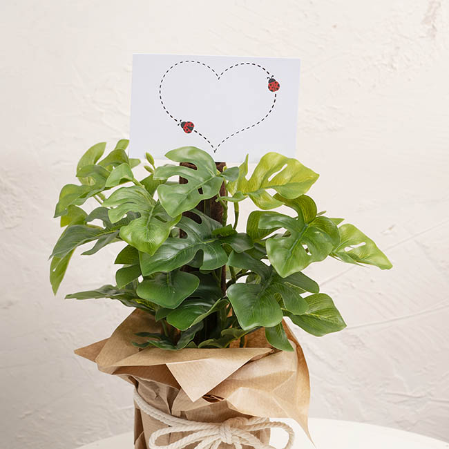 This pack of White Dotted Heart with Lady Bugs florist Cards displays a sweet and playful design of a heart on white kraft. Designed with florists and hamper makers in mind, these cards slide perfectly into a card fork. Alternatively, use these cards as an alternative to a traditional, larger card for a brief and tender message.