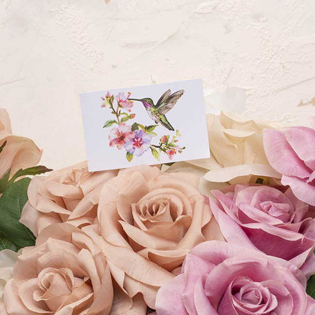This pack of Hummingbird & Flower Branch florist Cards displays a watercolour-style illustrated design on White kraft. Designed to fit seamlessly into a card fork, these cards are perfect for wrapped bouquets, hamper box gifts, and potted plants—whether on display in-store, on their way to a recipient, or showcased in the home. They can also be used as a more compact alternative to a traditional greeting card, ideal for short and heartfelt messages.