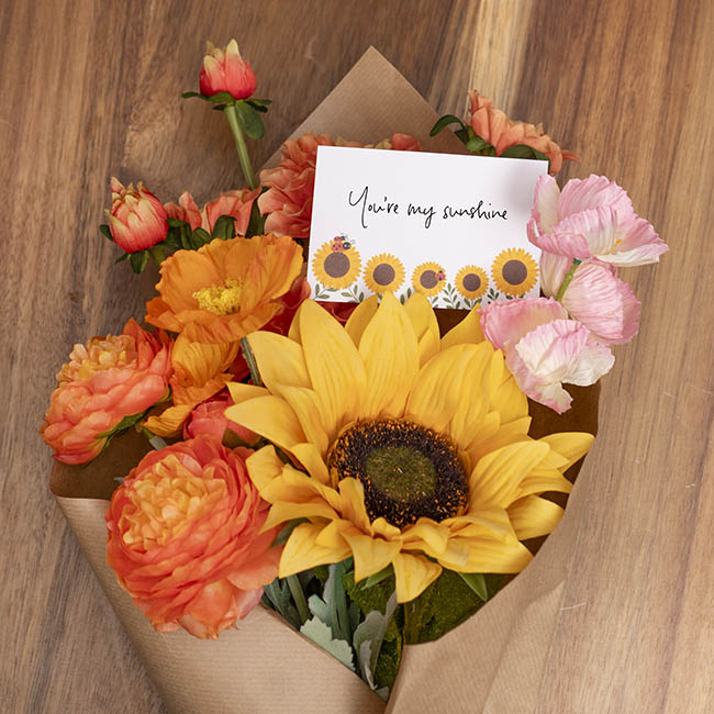 This pack of Sunflowers & Lady Bugs florist Cards displays an illustrated design on White kraft. Designed to fit seamlessly into a card fork, these cards are perfect for wrapped bouquets, hamper box gifts, and potted plants—whether on display in-store, on their way to a recipient, or showcased in the home. They can also be used as a more compact alternative to a traditional greeting card, ideal for short and heartfelt messages.