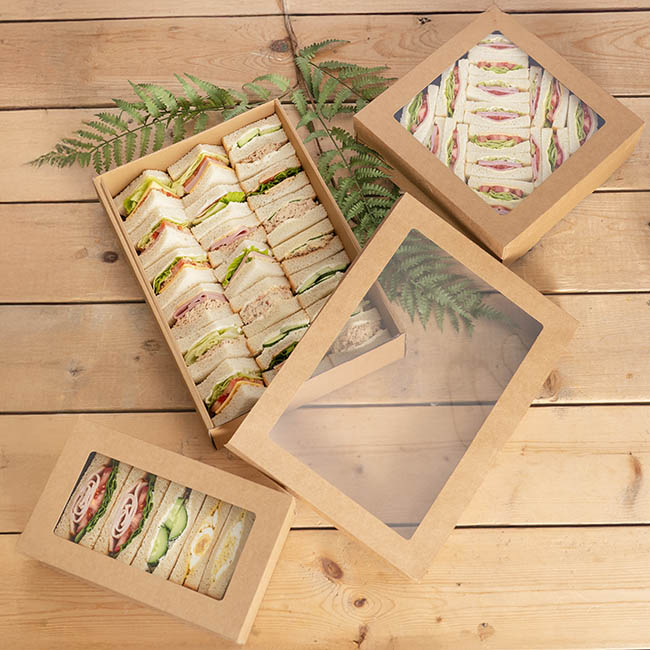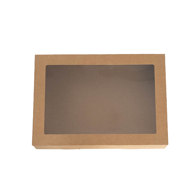 This window catering box is perfect for sandwiches, fruit, baked goods and desserts/pastries/slices. Designed to hold multiple items, this catering kraft brown box with window is 36cm wide, 25.5cm deep and 8cm high.