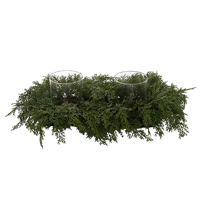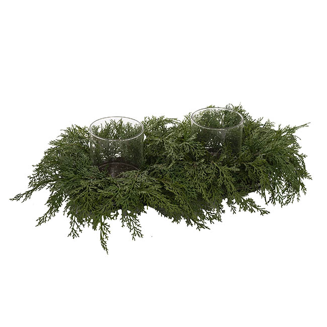 This candle holder measures 60cm long, 32cm wide, and 14cm tall. The diameter of each glass sleeve measures 10cm. As such, this product is suitable for use with candles which have a diameter of less than 10cm. This item is sold individually.