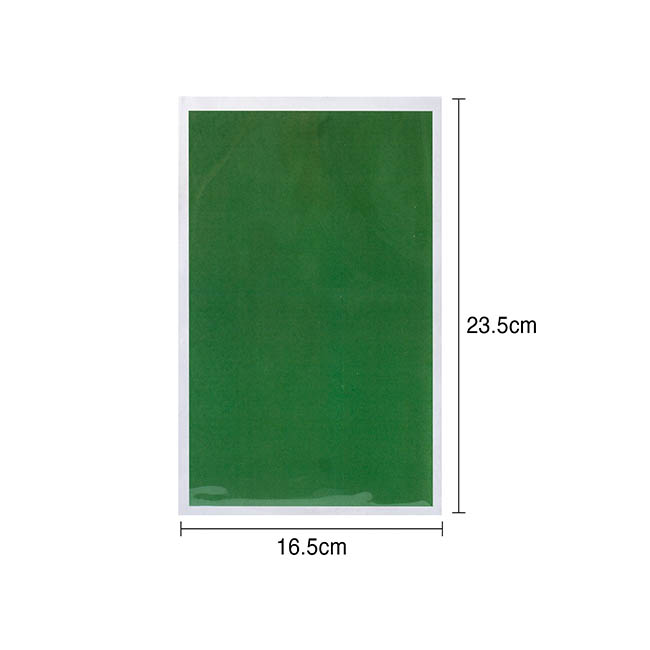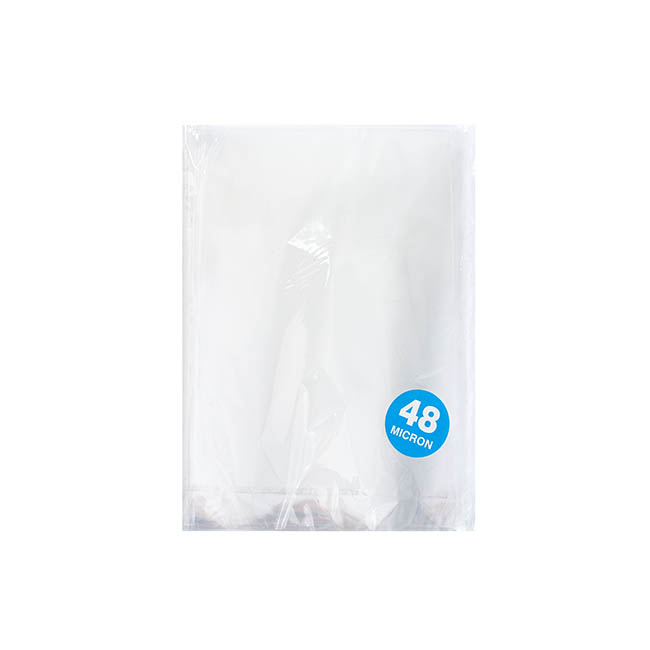Our P16 cello bag is made from 48 micron BOPP and measures 16.5 x 23.5cmH. It is not self sealing.