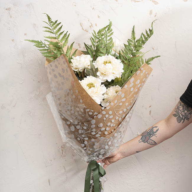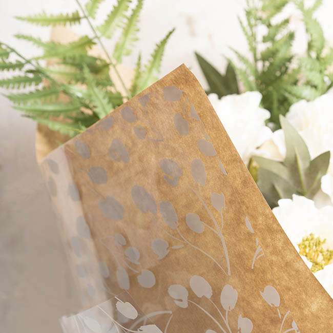 Underlay with a contrasting colour of wrap to bring out the design of the wrap, ideally kraft paper or a plain cello. This wrap is perfect for your next bouquet of flowers, to line a flower hat box, or for decorative hamper wrapping.