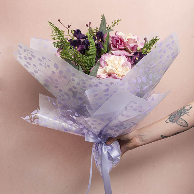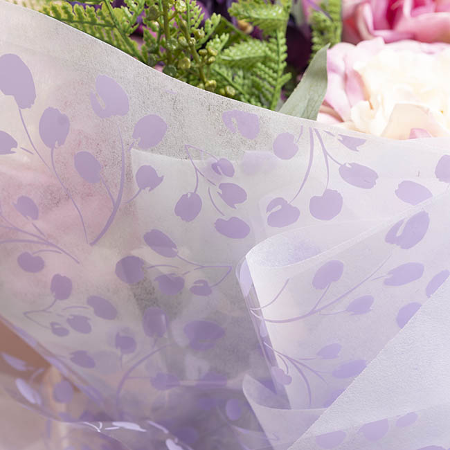 Underlay with a contrasting colour of wrap to bring out the design of the wrap, ideally kraft paper or a plain cello. This wrap is perfect for your next bouquet of flowers, to line a flower hat box, or for decorative hamper wrapping.