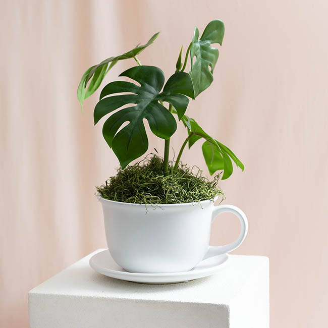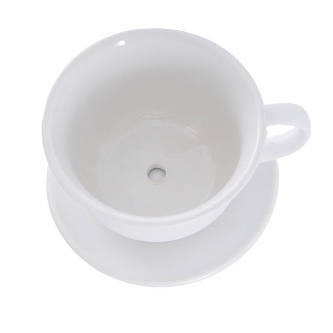The cup has a diameter of 17cm with a slight lip at the edge of the rim and stands at a height of 12cm, complete with a convenient drainage hole making it perfect for both fresh and artificial floral arrangements. The attached plate measures 21cm in diameter. Please note: this is sold as one piece, with the cup fused to the plate.