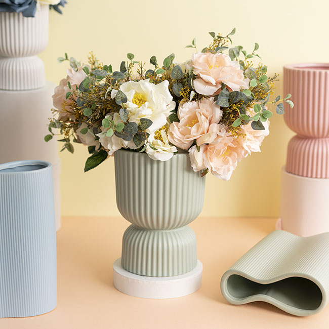 This piece measures 15cm at its widest point and 20cm tall. The bottom 'foot' component measures 7.5cm tall, and the vessel itself measures 13cm tall. Each vase is sold individually and is available in two sizes and four other complementary colours.