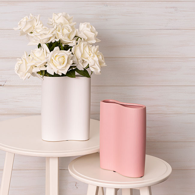 The diameter of the inside of the vase at its widest point measures 15.5cm. At the smaller end of this irregular 'figure 8' shape, the vase measures 4.2cm at its widest point. At the larger end of this 'figure 8', the vase measures 5.3cm at its widest point (interior measurements). The overall height of this vase is 23cm. Each vase is sold individually and is available in four other complementary colours.