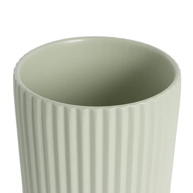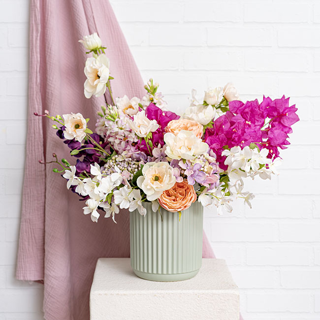 This Cyprus ceramic vase featuring a ribbed texture with a light pink matte finish. This style and colour will blend in most home decor. Fits a 1/2 floral foam brick and is waterproof making this vase a great base for modern flower arrangements.