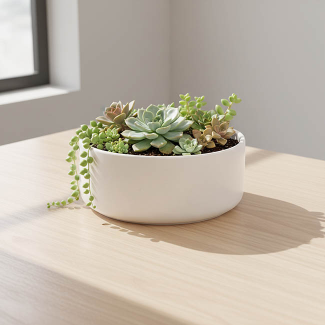 This bowl is fully glazed, both inside and out. It is waterproof and features no drainage hole. It can accomodate one brick of floral foam and features scratch pads on the base.
