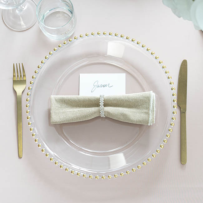 Elevate your table setting with our exquisite Clear Acrylic Charger Plate with Gold Beaded Edges. Designed to add sophistication to any dining experience, each plate features meticulously heat pressed gold beads along the edges for a touch of elegance.