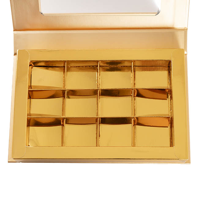 Display your chocolates or sweets beautifully with these luxe style treat boxes in matte gold. The box has a magnetic closure with bright shiny gold insert (included). Window to display your creations. Holds 12 (dozen) chocolates/sweets. Each insert is approximately 3.7cm x 3.2cm with a height of 2cm. Insert is food grade. 2 horizontal insert dividers are removable if you have longer chocolates leaving 4 long compartments approximately 3.2cm x 10cm. Overall box dimensions are 21cm wide x 13.5cm deep x 3cn high. Window area is 13.7cm x 9cm. Sold as an individual box.