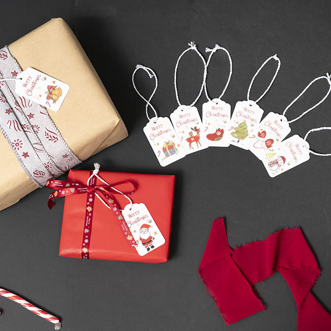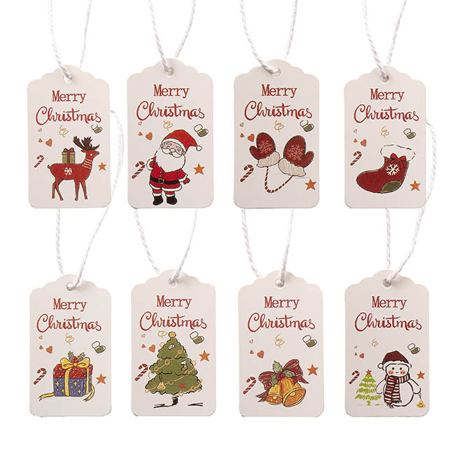 These gift tags are available in a pack of 48. Each card measures 4.5cm wide, and 6.8cm tall. These pre-packaged cards include white string, for attachment to gifts. Available in eight prints, each pack comes with six cards in each design.