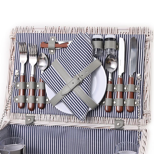 Our 4 Person Picnic Basket in Satin White is a generously-sized basket that enjoys all the conveniences necessary for a picnic for four. Featuring secure compartments for plates, cutlery, and glassware, this basket also comes with the added bonus of a built-in cooler compartment.