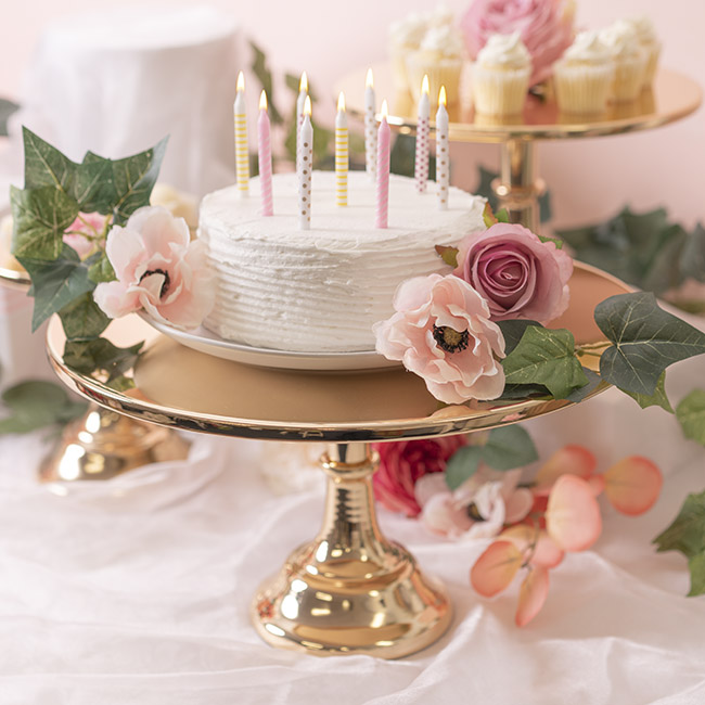 This Classically-shaped Chrome Gold metal Cake Stand has a simple design and modern, clean lines. Use this stand to elevate and display delicious treats, or alternatively, use it to display a centrepiece, wares for sale, or as part of home decor styling.