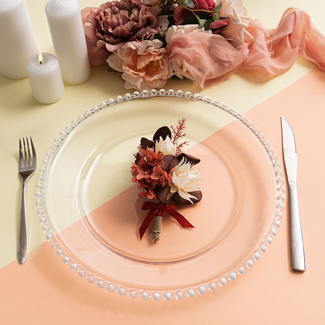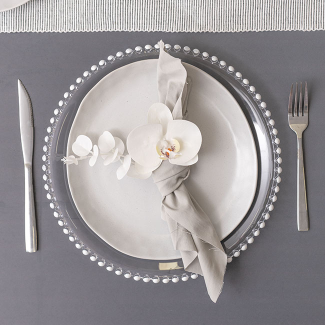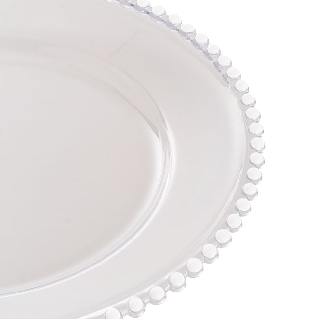 Elevate your dining setting with this simple yet elegant set of clear charger plates with a rustic painted white beaded edge. Each shallow plastic plate can be placed under your service plates to create a stunning tablescape. They can also be used for a candle display or as an elegant table centrepiece.