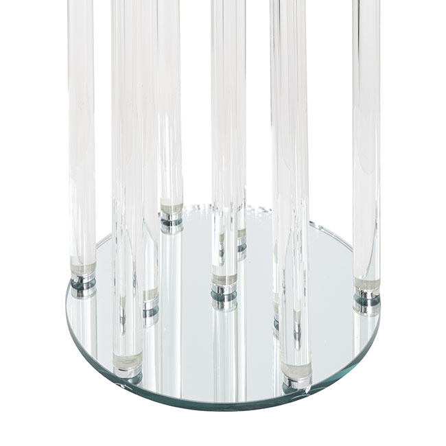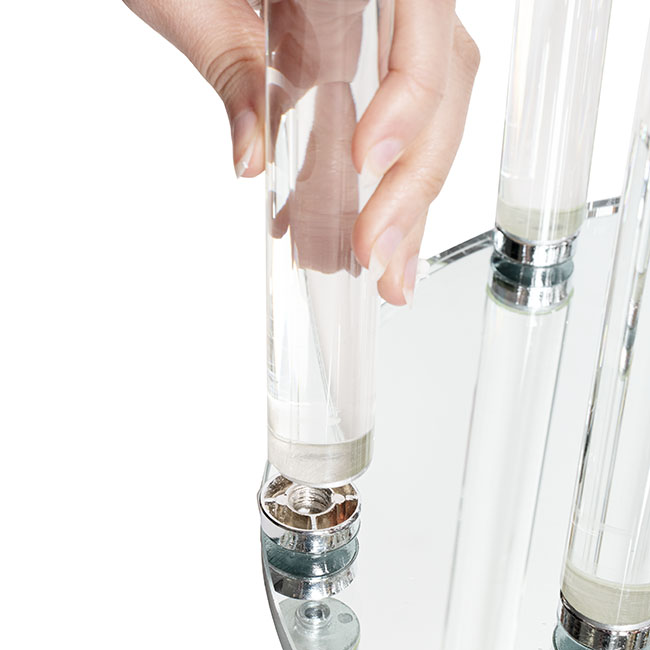 Assemble by screwing candle holder pieces into mounts on the base plate. Base plate has a glass mirror finish and measures 25cm x 25cm. Entire structure made of glass, excepting candle stick poles, which are made of acrylic. Sold individually.
