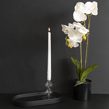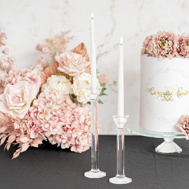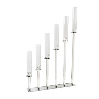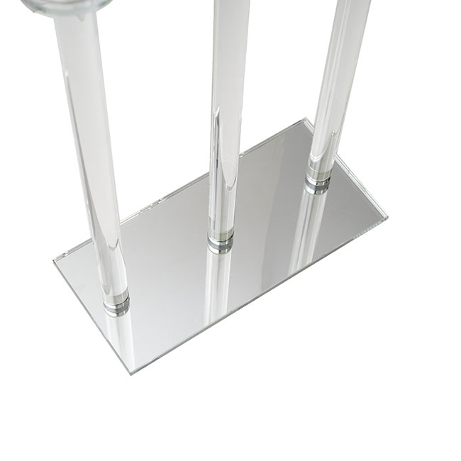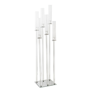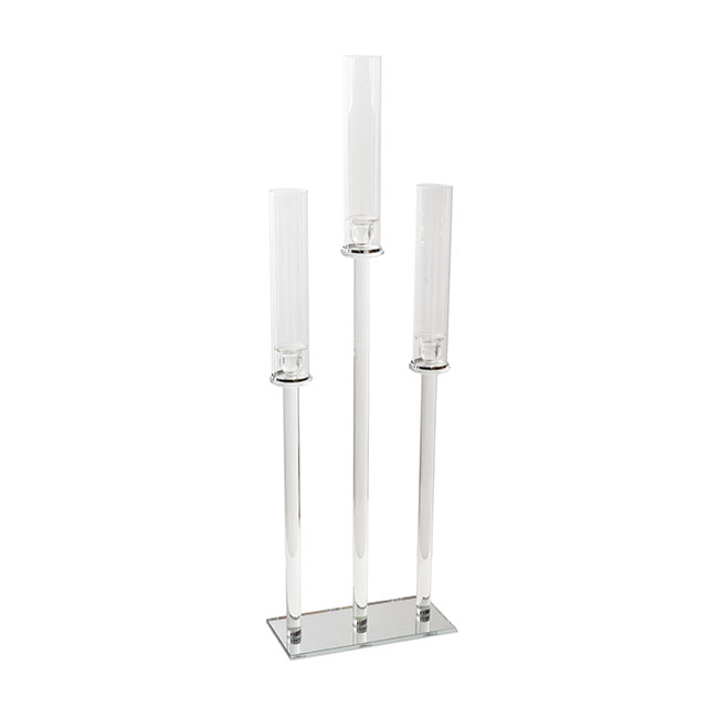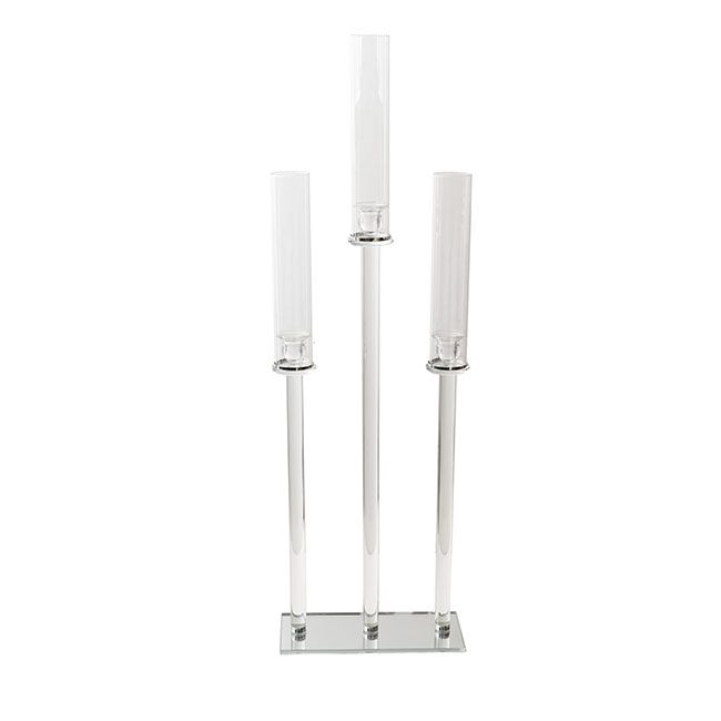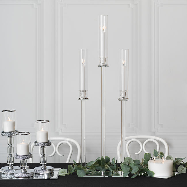 Introducing our Linear Glass Candelabra, a sleek and contemporary addition to elevate your ambiance. This candelabra features three holders seamlessly aligned with the base, fashioned from a reflective mirror measuring 30cm by 14cm, not only enhances the overall aesthetic but also adds a touch of glamour by creating a stunning play of reflections. Perfect for a dining table centerpiece or as an accent on a mantel, our Linear Glass Candelabra merges form and function effortlessly, transforming any space into a haven of refined style and gentle illumination. Taper candles can be used as well as pillar candles up to 5cm in diameter. The glass sleeve measures 5.5cm in diameter and 30cm tall. The candle holders on either side measure 75cm and the middle measures 95cm.