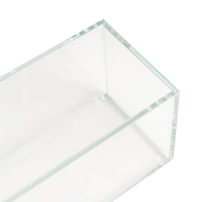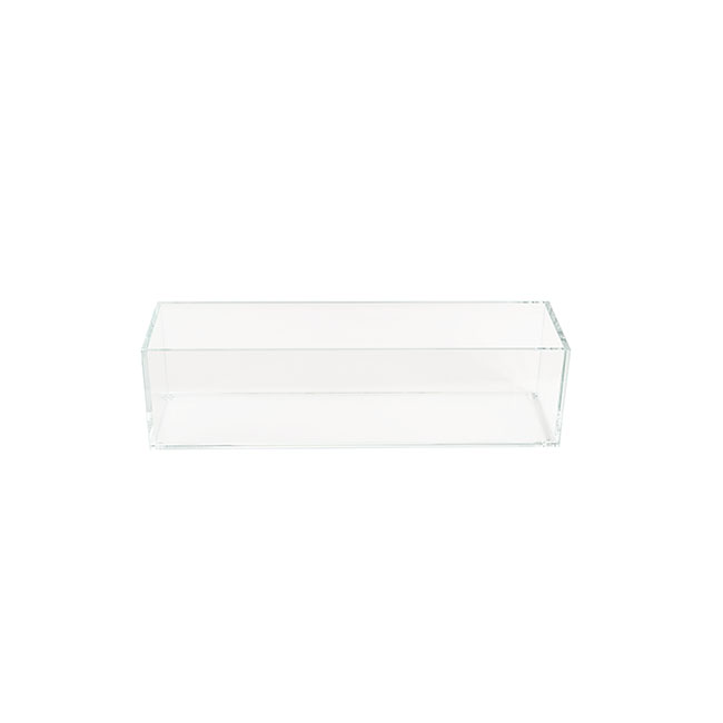 This clear vase measures 6mm thick, 30.5cm wide, 10cm deep, and 10cm high. Internally, this vase measures 9.5cm tall, 29.2cm wide, and 8.8cm deep. Each corner of the base has a clear rubber pad. This vase is also available in a larger size.