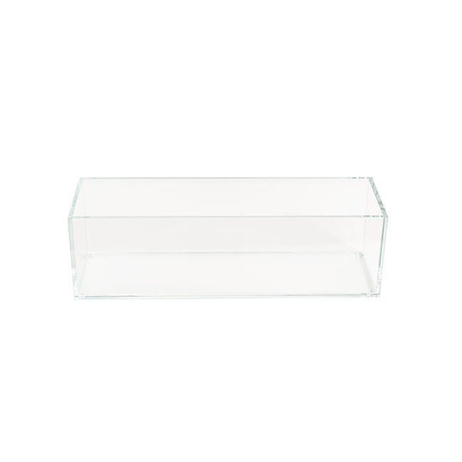 This clear vase measures 6mm thick, 40cm wide, 12cm deep, and 12cm high. Internally, this vase measures 11.5cm tall, 39.3cm wide, and 10.8cm deep. Each corner of the base has a clear rubber pad. This vase is also available in a smaller size.