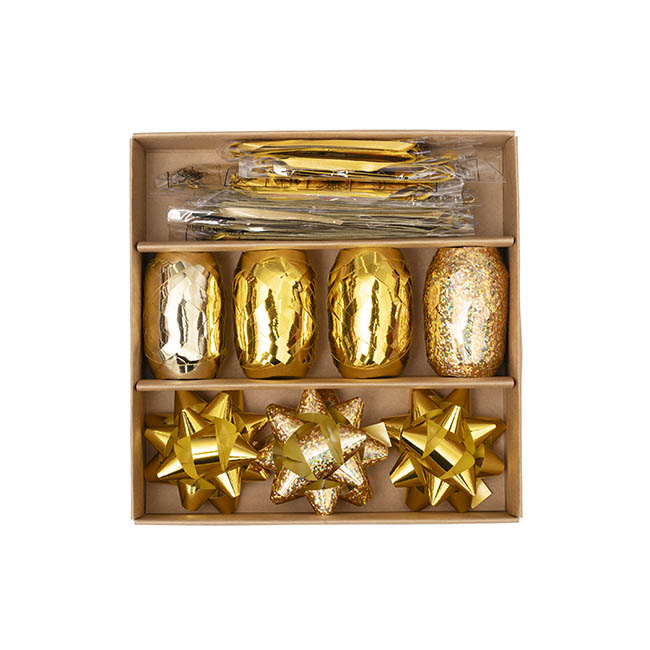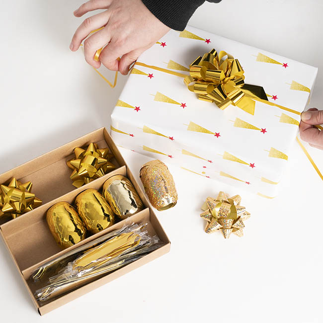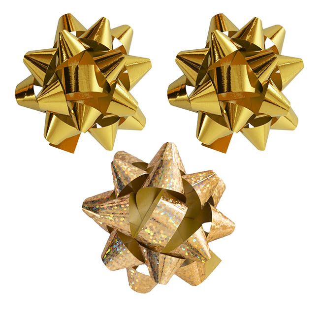 3 pre-made star bows with adhesive back 6.3cm in metallic gold and faux glitter gold.