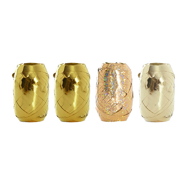 4 curling ribbon eggs 5mm x 10m in metallic champagne, metallic gold and faux glitter gold.