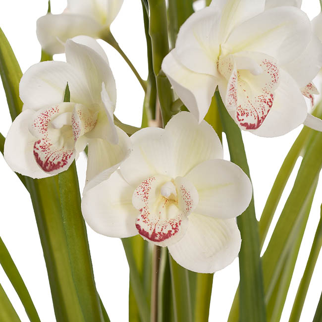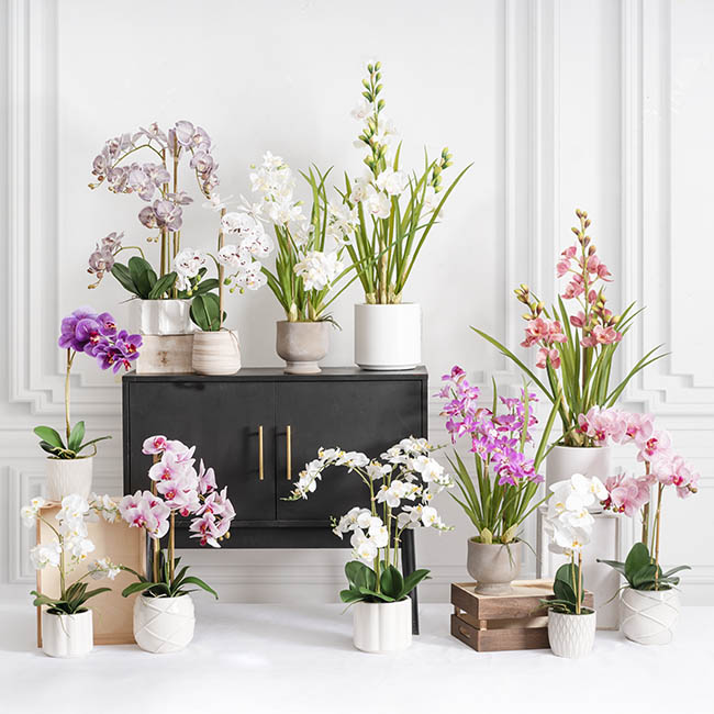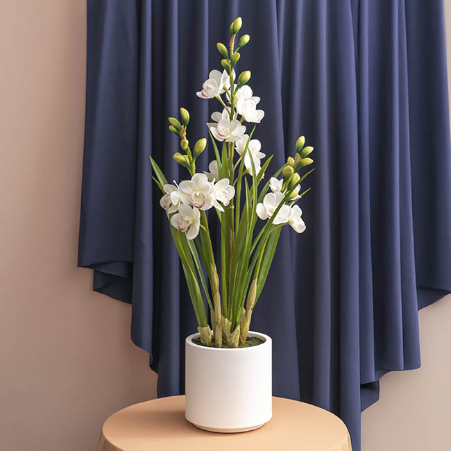 Add a touch of sophistication to your home with this elegant potted Cymbidium orchid, featuring three stems of real-touch white orchids in a simple white plastic pot. The pot measures 17cm in diameter and 18cm tall, making it the perfect size for any space. Upon unpacking, the arrangement can be styled to your liking, and for a more realistic finish, you can spray the leaves with Koch & Co's leaf shine spray to achieve a glossy, fresh appearance.