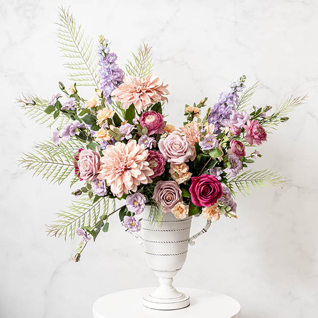 This Decorative Vintage-Style Flute Metal Vase in Antique White is a classically elegant vessel with enduring appeal. With elegantly-detailed curved handles, this is a vessel that suits classically romantic, as well as new wave fusion styles of decor. This metallic-style vase also features a rustic patina, for extra character.